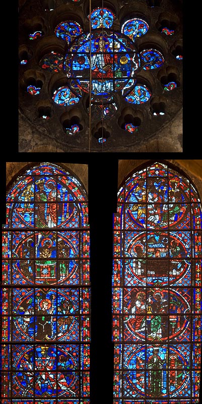 This window, occupying the first clerestory bay on the east of the north transept, seems to have been a donation of the de Beaumont family, whose arms are shown in the donor panels at the bottom of each lancet. Otherwise, the left hand lancet depicts a highly condensed version of the St Eustace legend (see bay 43), while the right shows three scenes which are normally described as being from the life of Christ, though it might be more correct to say they are three of the 'Joys of the Virgin' (Annunciation, Nativity & Epiphany). The choice of narratives are thus highly gendered to suit the two donor figures - for the male donor, shown in full battle armour on his charging horse, the left lancet depicts a saintly knight whose example he might emulate, whilst the donatrix is shown beneath the ultimate female role-model (here shown in episodes that all stress her role as mother). Sadly the window is quite corroded, hence the less than perfectly legible state of the photographs. | |||||||