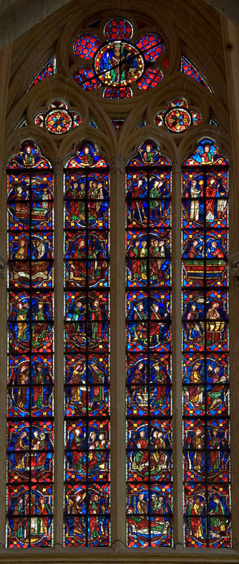 Some of the scenes from the life of the Evangelist are highly distinctive, suggesting the window's designer was following a source quite different from the usual version of John's life that features in the Golden Legend. For more windows dedicated to John the Evangelist, see Chartres Bay 48 and Bourges Bay 22.