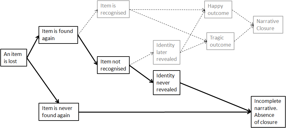 Two of these paths, corresponding to stories in which an item is lost and then never found again, or else is found but never recognised, can be regarded as unsatisfactory in narrative terms, since they lack any kind of narrative closure: